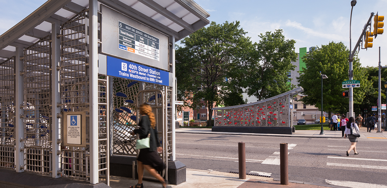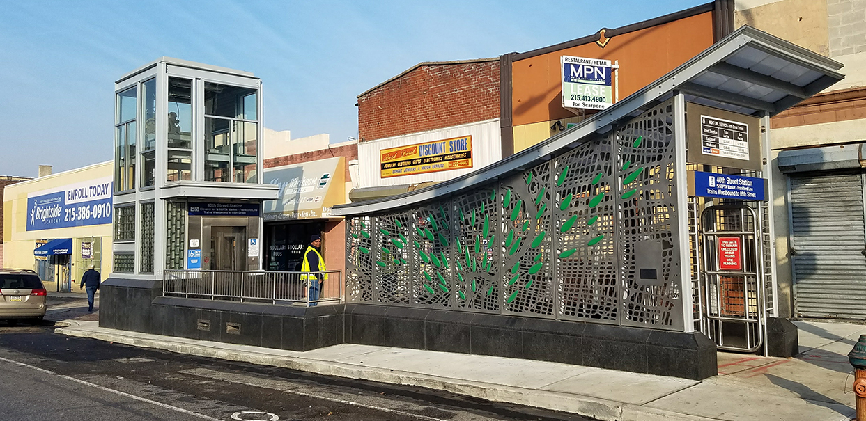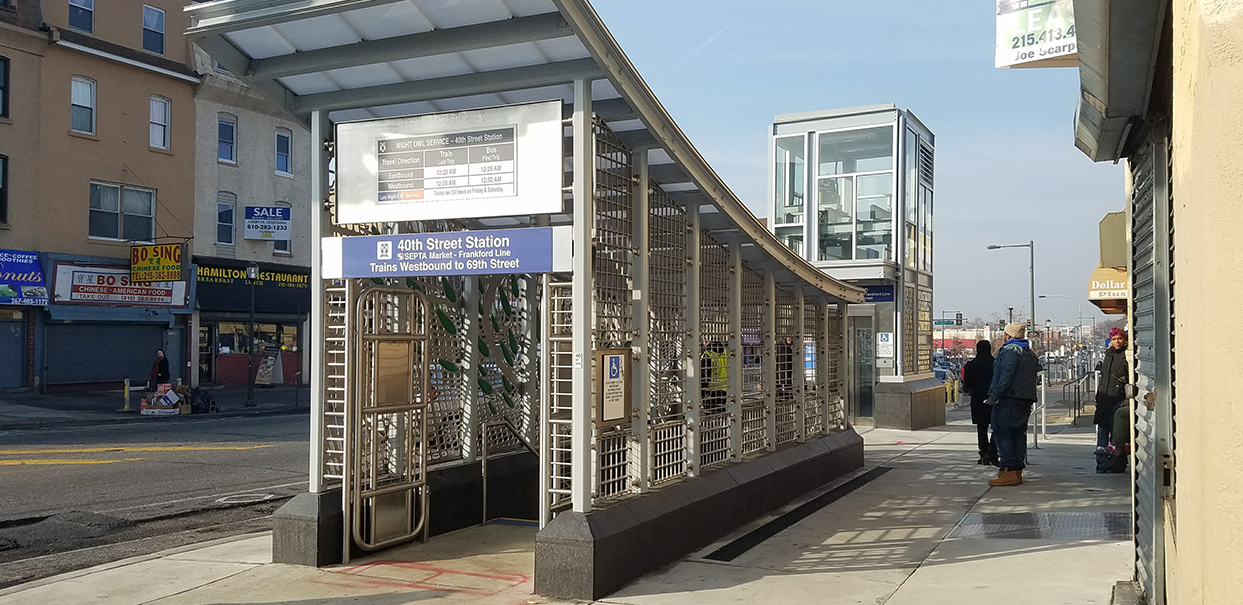 Sowinski Sullivan was the architect on a team tasked with improving conditions at Philadelphia’s 40th Street Station on the Market-Frankford subway line. The project goals were to improve ADA-compliant accessibility, enhance safety and security for both customers and employees, and improve operational efficiency and customer convenience. The scope of work included installing two elevators for pedestrian access from street level to the eastbound and westbound platforms and designing new head houses at each of the four stairways. In addition to providing compliance with ADA standards and regulations, additional work included making miscellaneous repairs throughout the existing station, improving the electrical and mechanical systems, upgrading the finishes and furniture at the platform level, renovating or replacing the existing restrooms, and installing new ADA-compliant way-finding signage.