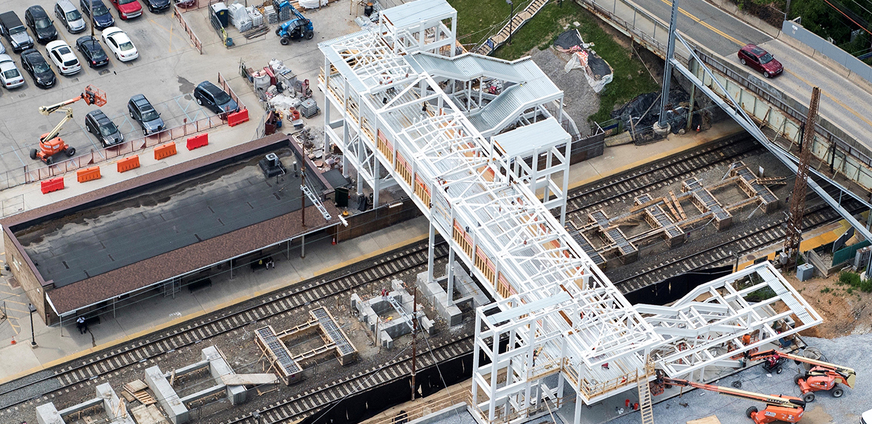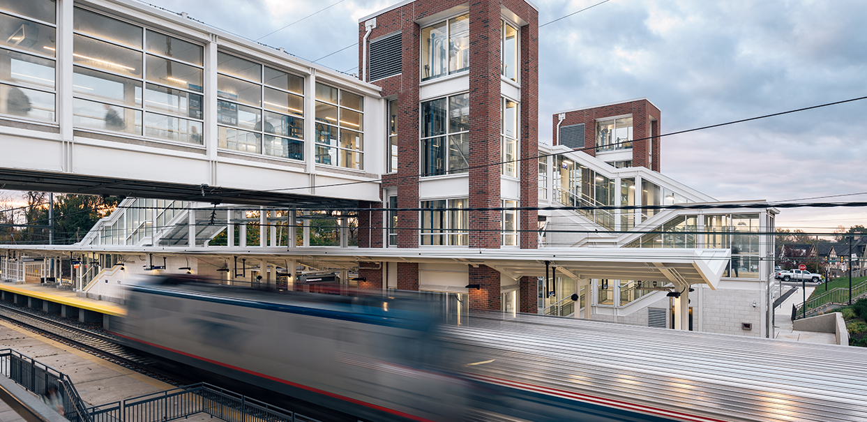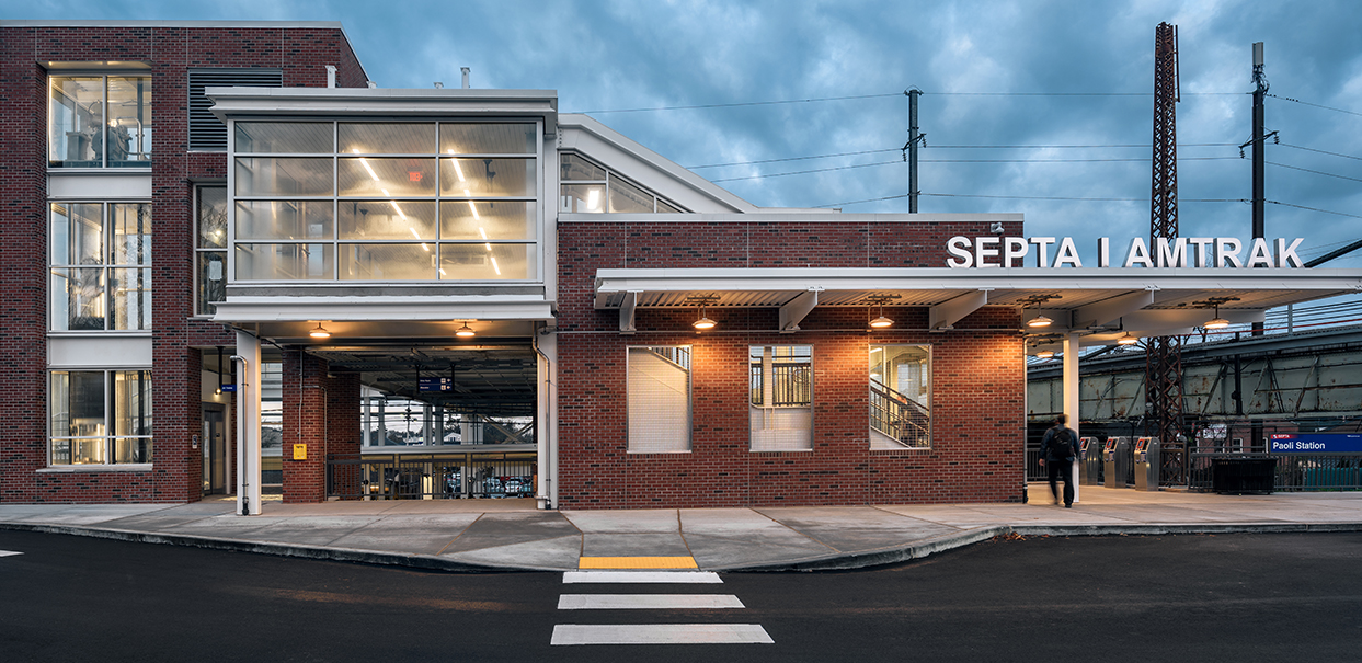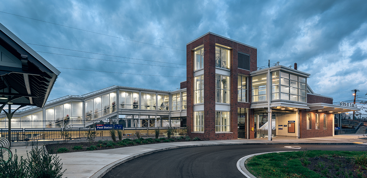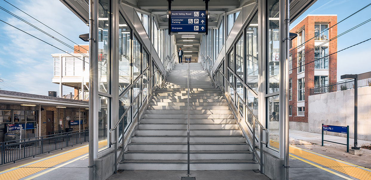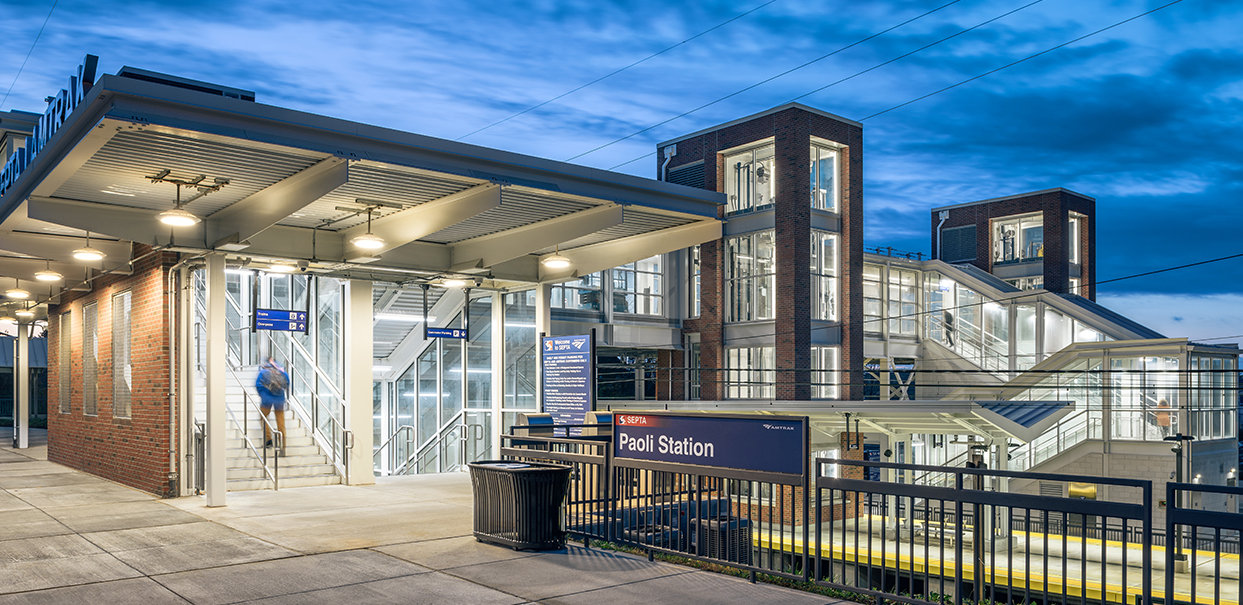 Sowinski Sullivan was the architect on a team tasked with providing ADA-compliant accessibility at Paoli Station, which is served by both Amtrak and SEPTA. The Paoli Station accessibility improvements were the first phase of the overall Paoli Intermodal project. The project scope included a new high-level island platform, a pedestrian overpass, stairs, elevators, and development of the surrounding site. Also included in the project was deconstructing, restoring, and relocating a historic entry canopy on the north side of the project site, and repurposing it as covered bicycle storage. Sowinski Sullivan developed a comparison of Amtrak and SEPTA station guidelines to support critical decision making and implemented these decisions through construction documents. The design ensured appropriate site movements for buses, cars, taxis, jitneys, pedestrians, and bicyclists with a goal of creating a safe, convenient, and accessible passenger experience.
