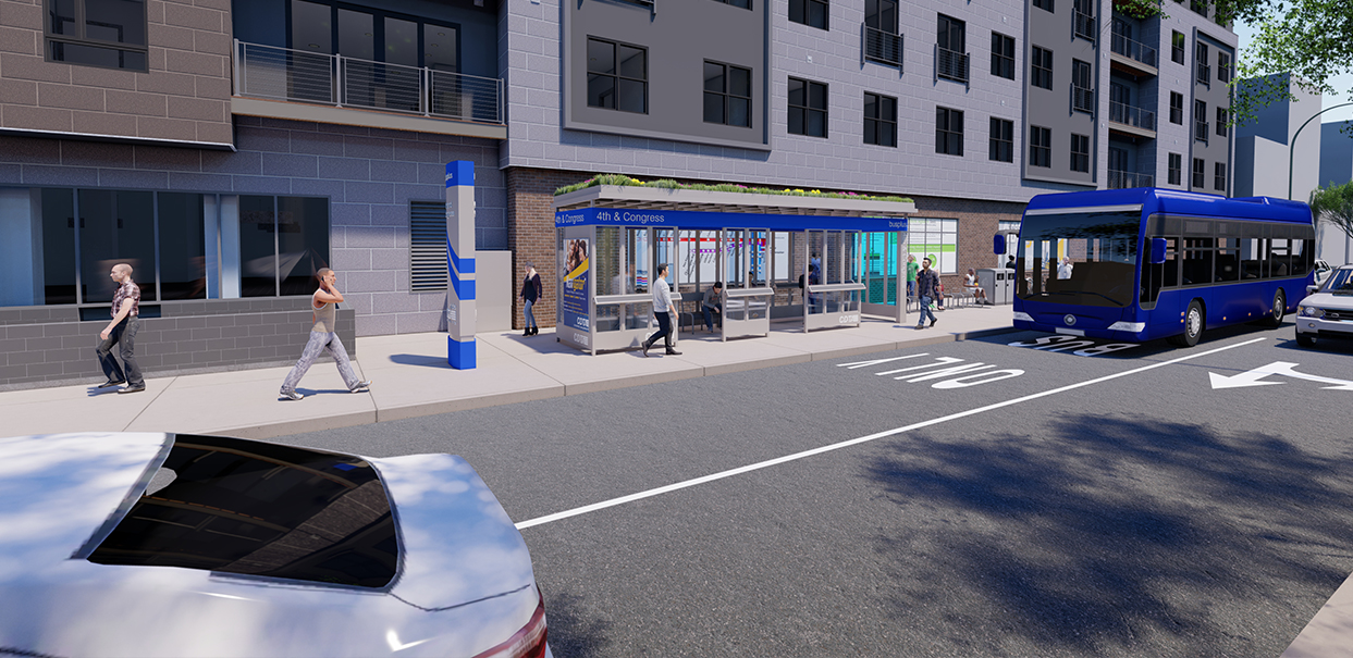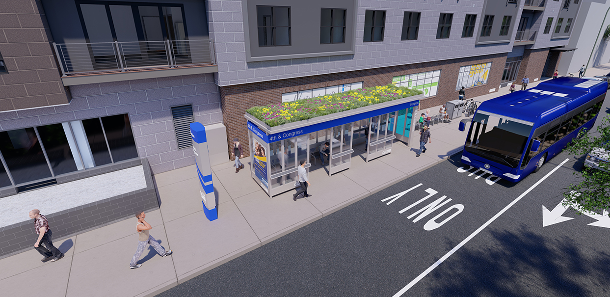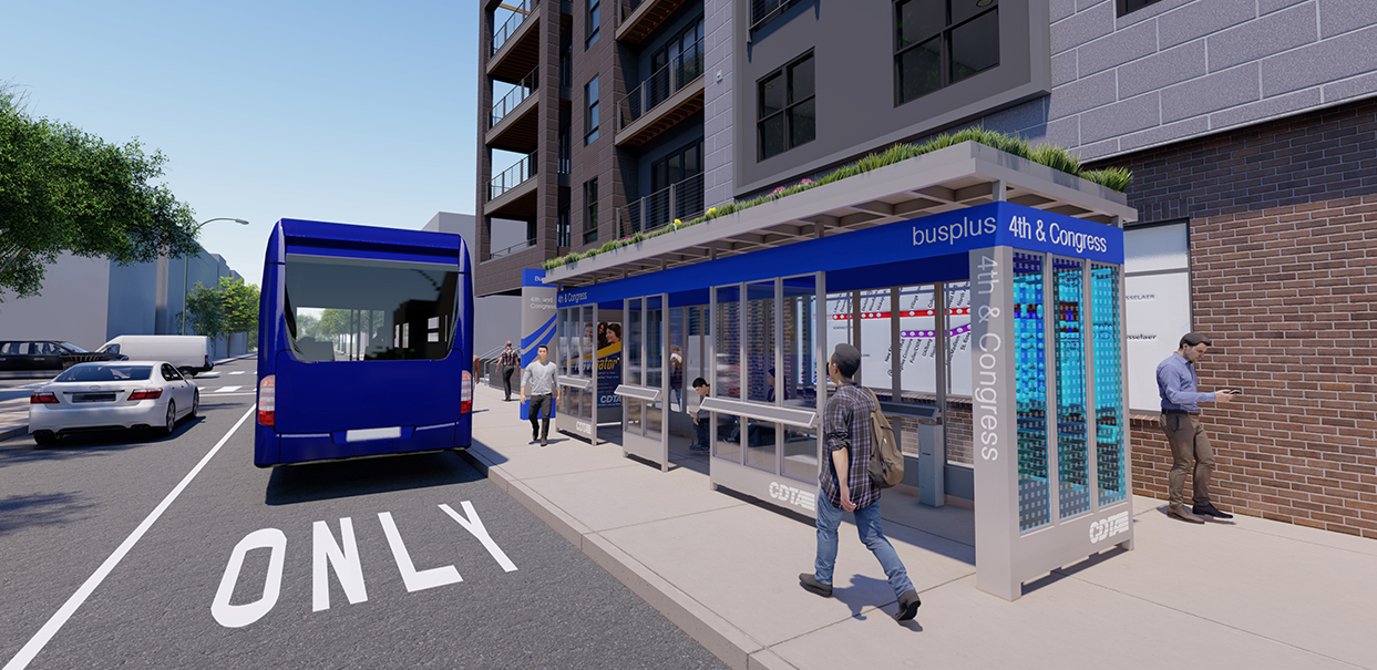 Sowinski Sullivan provided conceptual design services to CDTA for the development of a new prototypical bus shelter. At completion of design, renderings, and basis of design documentation, Sowinski Sullivan worked with a prefabricator to develop final shop drawings for the unit. The shelter incorporated sustainable design strategies and was piloted at a prominent location in Troy, New York. A green roof was implemented on the shelter roof to retain heat and control stormwater runoff, while transparent photovoltaic glazing on south facing surfaces captures electricity to be used for lighting at the bus stop. Solar powered trash receptacles, benches, lean rails, and bicycle racks are other amenities were included at the shelter.
