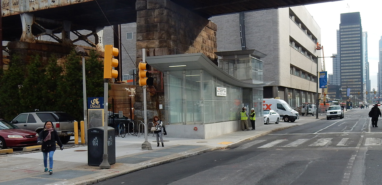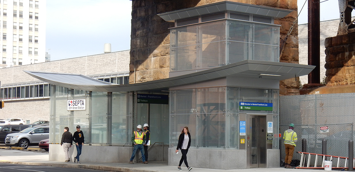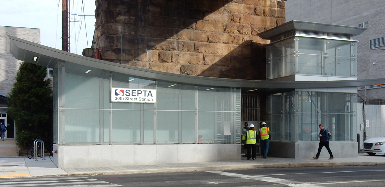 The scope of work included replacing the existing SEPTA head houses located at the northwest corner of 30th and Market Streets and at the southwest corner of 30th and Market Streets with new structures which maintain the program of the existing head houses. At the northwest corner head house a pass through elevator was designed for pedestrian access from street level to concourse along with a stair that incorporated an integral bike channel allowing for improved transport of bicycles from street level to concourse level. In addition, SSA designed the station to be upscaled with point support glass, updated lighting, glass pavers to allow light to reflect throughout the concourse, re-designed fare line, an elevator for pedestrian access from concourse level to platform level, upgrading station finishes, and installing new ADA-compliant way-finding signage.